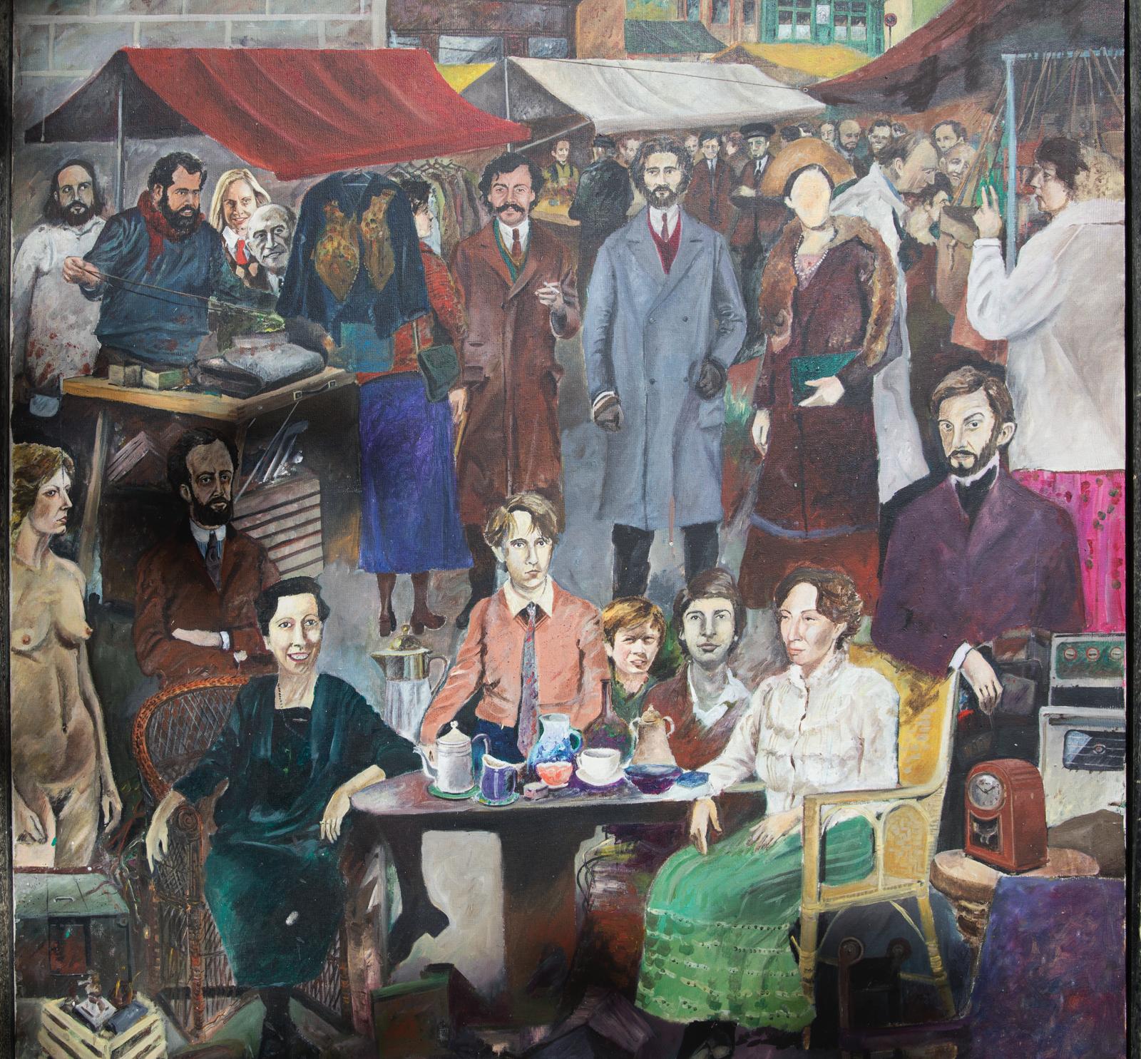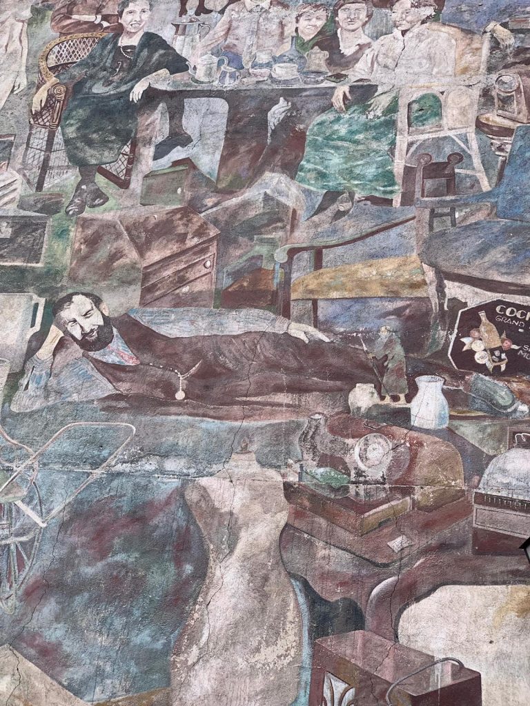 El frontal verde de La Mandrágora aparecía antes de que, como dijera Sabina, el sol fuera quemando la ropa y los colores se fueran diluyendo en este Madrid donde, como en un patio de corrala, se sienta toda una familia, la del artista, contemplando la vida. Puri Laiseca, suegra del artista, se sienta junto a sus nietos Juan, Gabriel y Tomás, sus tres hijos, su padre, su suegra y el ya mencionado Sabina. Lucía, primera mujer del cantautor, “que aceptó posar en pelotas y luce un desnudo muy aceptable”, Alberto Corazón, Juan Luis Cebrián… El propio Cavestany se autoretrata ante la mesa de trabajo y su esposa, Begoña Sánchez, acompaña a Sabina en la cabeza de la marcha. Tumbado en la parte inferior, Manolo Paniagua, fundador de La Mandrágora y vendedor del Rastro, rodeado de sus objetos, reposa tranquilamente asentado en su mercado tradicional, todos llevan ropa de otra época como si de una fiesta de carnaval se tratara. Entre los objetos, la máquina de coser y la vieja radio, una carta al estilo de la publicidad de los 50 anuncia el título de la obra, Cocktail Gran Luxe, “sírvase muy frío”, una botella de soda que quizás se quede sin abrir para aquellos que prefieren el whisky sin soda y el sexo sin boda. Pero el mural se desquebraja, sus personajes tienen mala cara, y aunque el propio artista ha tratado muchas veces de recuperarlo, el vacío y el hueco han hecho mella en su ánimo. Mientras Embajadores es considerado el barrio más cool del mundo, una parte importante de su historia se desvanece.